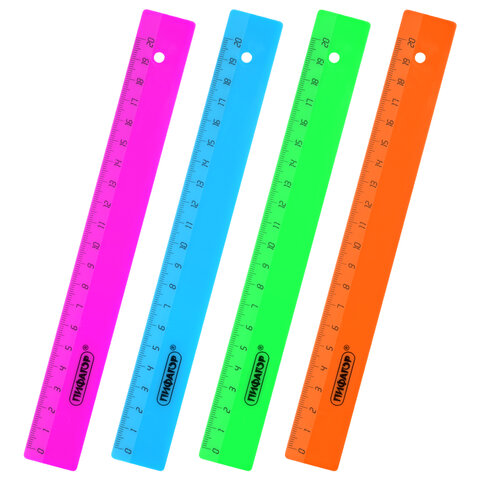 Изготовлена из прозрачного тонированного пластика ярких цветов. Линейка имеет безопасные закруглённые углы и четкую разметку, что делает ее удобной в использовании. Поставляется в нескольких вариантах цвета (без возможности выбора). Упакована в пластиковый пакет с подвесом.